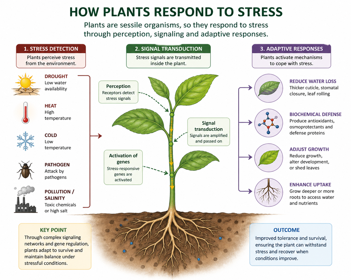 In summary, understanding the physiological mechanisms through which plants respond to stress provides insight into their resilience and adaptive strategies. Further research into these processes enhances our knowledge of plant biology, which is essential for developing stress-resistant crop varieties in an era of global climate change.